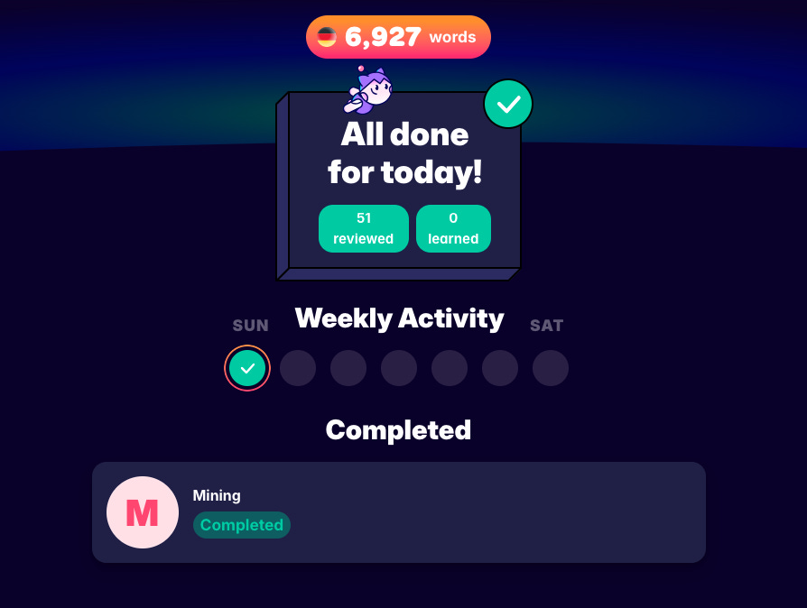 The Migaku app’s German parsing has, sometime in the past month, I think, completely broken. Even some much more advanced users have stopped mining completely. The app became effectively unusable for making new cards, though it's still fine for doing reviews. For those who don't use Migaku, I'll try to give an explanation. The parser tries to take words you haven't marked as known, and highlight them in the text so you can make a flashcard from them. Recently, the parser often detects words as completely different words. For example, it will often misinterpret nouns as a much less commonly used verb form. This means that you have a flood of words highlighted, 95% of which you either already know or are being parsed to a completely different word. Unfortunately, it seems that many beginners have not really noticed this, and there doesn't seem to be much of an effort to make the issue well known. Personally, I can't see how anybody could use the app for mining in this state without getting flashcards for words that aren't even in the sentence being mined, which amounts to completely erroneous flashcards. It's unfortunate that this issue has persisted for quite a while now, but the Migaku team is excellent. I've heard that they are actively working on it, and I have no doubt that when a solution is ready, I'll be back to mining again and going towards my 10k known words goal.