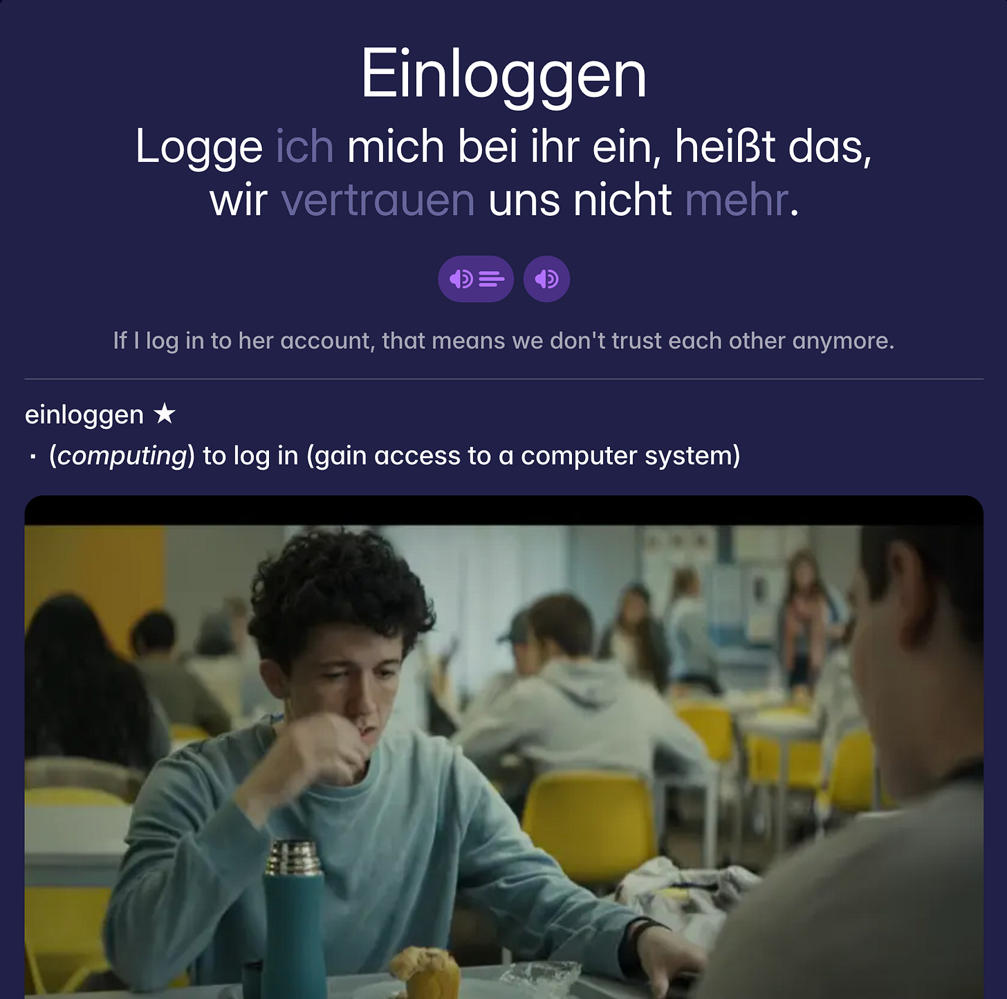 From an episode one rewatch of HTSDOF. Sometimes with separable verbs in German you need to manually modify the card so that you don’t just end up mining, ‘loggen’, which is not going to give you a definition which makes sense for this sentence.